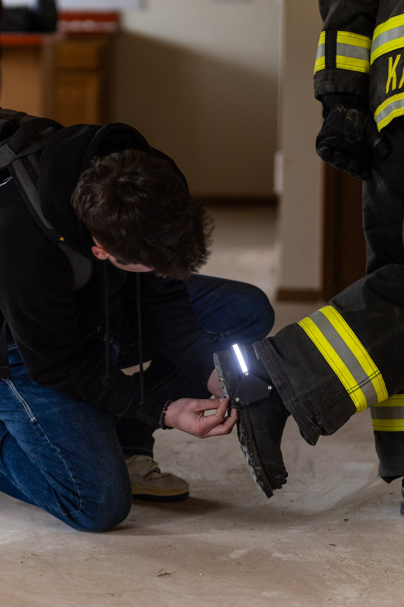 SafeStride enhances firefighter safety by delivering powerful LED visibility directly at ground level, where movement is most noticeable and often underrepresented. Designed to integrate seamlessly with turnout boots, it helps reduce blind spots and improve visibility in smoky buildings and unpredictable highway environments.
